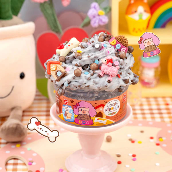 Get ready for a super snack-tastic slime adventure with Cocoa Kibbles Crunchy Slime! This creamy white slime is packed with crunchy kibbles that make the best snap, crackle, and pop just like your favorite cocoa cereal! Plus, it smells so yummy and cozy, you'll want to squish it all day long. Inside, you'll find cute charms like a fluffy poodle, a bone, a fun dog house, and a tasty dog treat, all mixed with colorful sprinkle fimos for extra silly fun. With its crunchy texture and stretchy goodness, Cocoa Kibbles is perfect for tons of squishy, crunchy playtime!