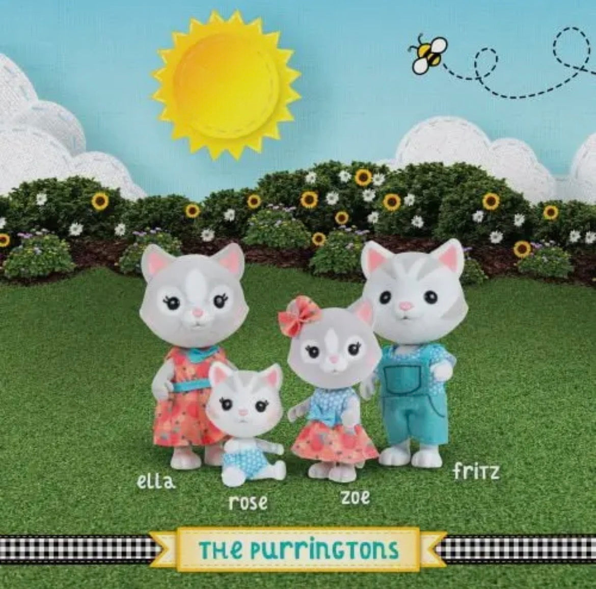 This miniature doll set includes 4 flocked cat characters: 2 parents and 2 kids