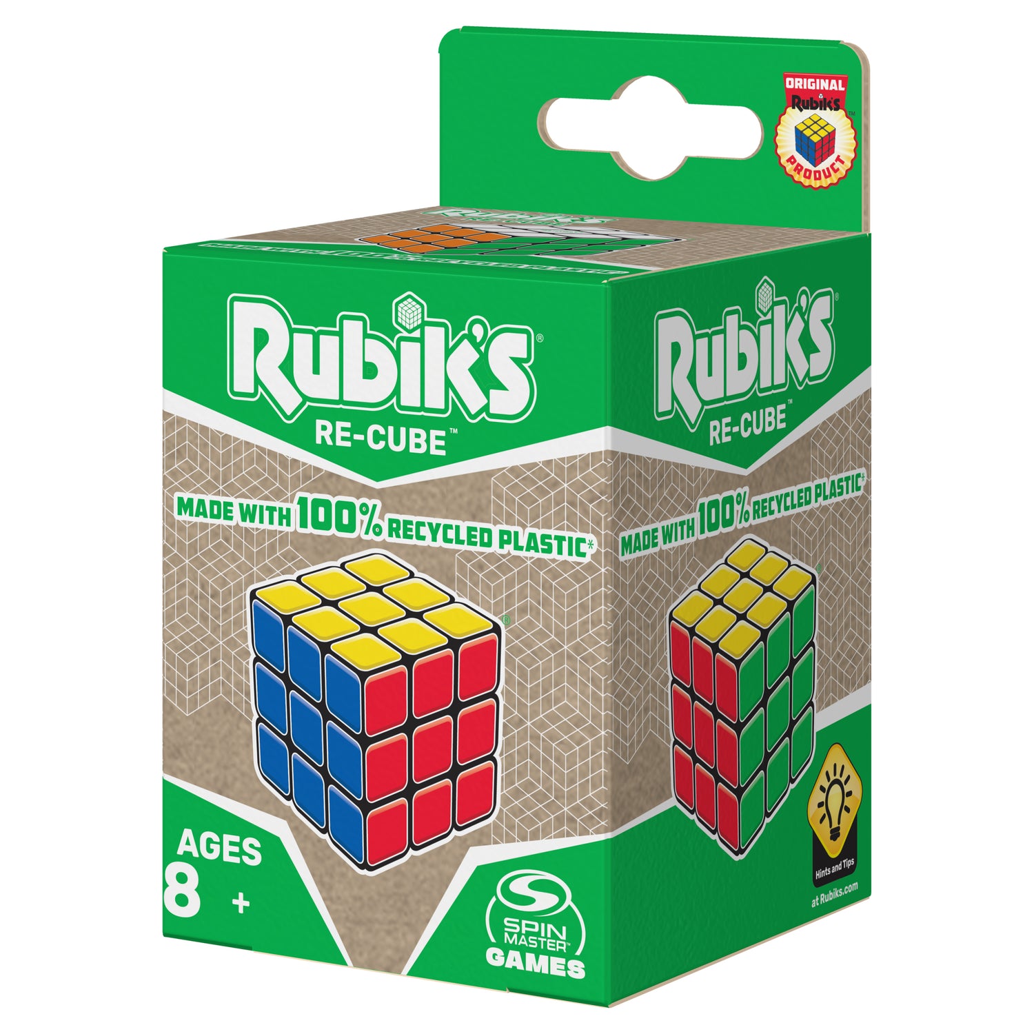 - MADE OF 100% RECYCLED PLASTIC: Rubik’s Re-Cube is the same 3x3 Cube you know and love, created with sustainability as top of mind. This recycled eco-friendly product is perfect for Earth Day or any day.