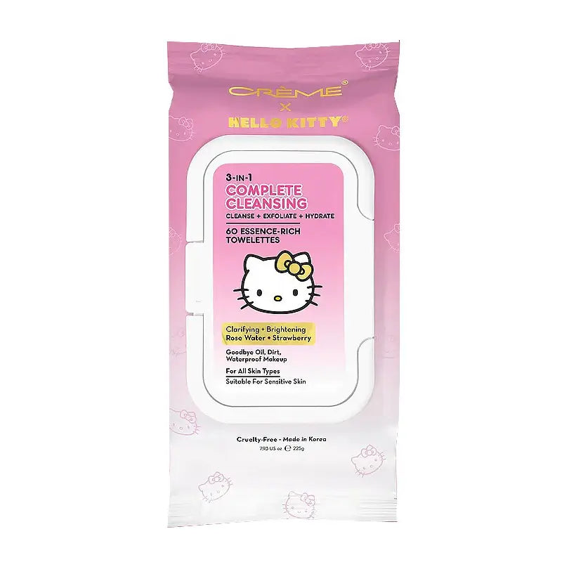 The Creme Shop x Hello Kitty HKCT8827-60 Rose Water + Strawberry 3-In-1 Complete Cleansing Towelettes. Cleanse, exfoliate, and hydrate skin with clarifying rose water and toning strawberry. These towelettes help remove impurities from face and body. For all skin types. Made in Korea.