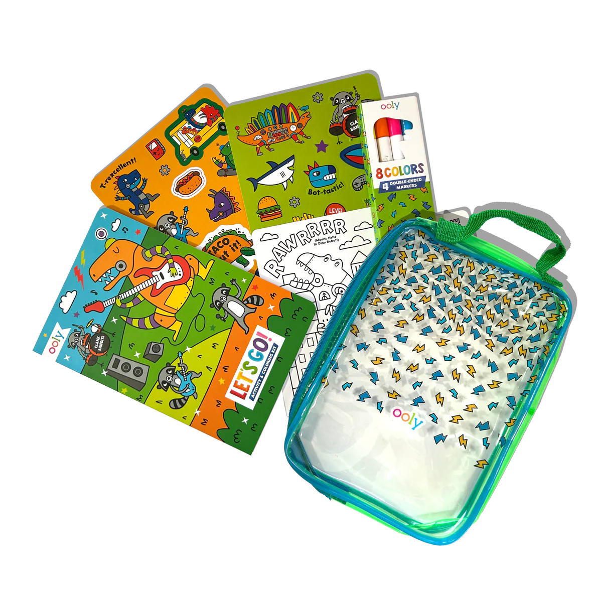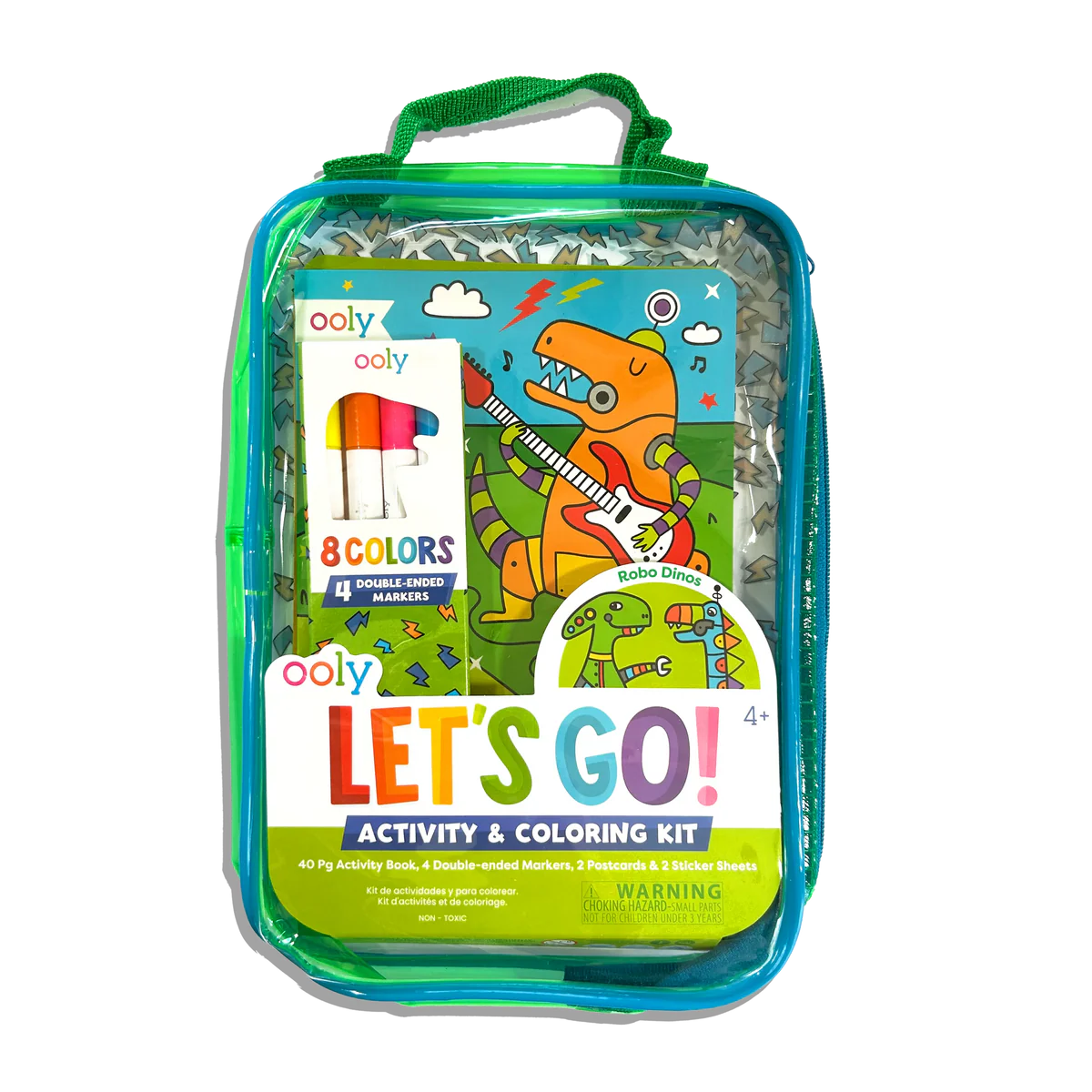 Keep kids entertained wherever they go with the Robo Dinos Let’s Go! Activity & Coloring Kit! This exciting kids' activity kit features robotic dinosaurs in a fun-filled 40-page activity book with color-by-number, puzzles, word searches, and games. It also includes two sticker sheets, two postcards, and four double-ended markers with eight colors, making it a complete on-the-go entertainment solution.